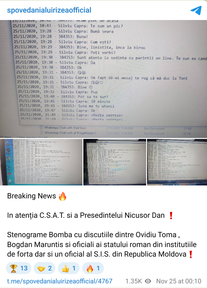 Pe contul său de Telegram, Cristian Rizea prezeintă pasaje din discuțiile pe care patronii patronii CryptoDATA, Ovidiu Toma și Bogdan Mărunțiș, le-au purtat cu „oficiali ai statului român din instituțiile de forță, dar și un oficial al S.I.S. din Republica Moldova”.