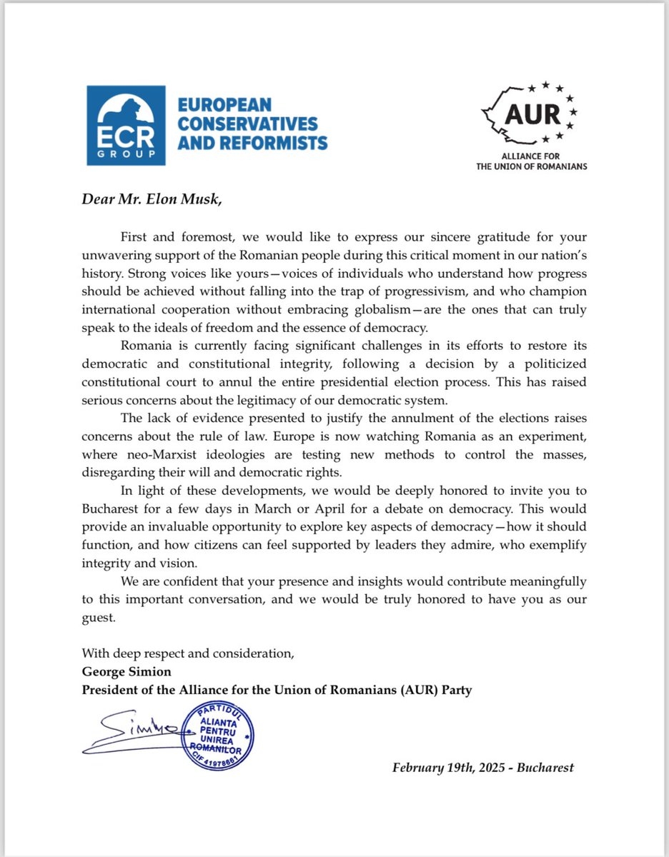 George Simion, președintele AUR și liderul suveraniștilor români, i-a adresat o scrisoare publică lui Elon Musk, pe platforma X, în care îl invită pe miliardar la o dezbatere despre democrație în luna martie sau aprilie a acestui an.