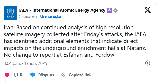 Într-o postare pe platforma de socializare X, AIEA a declarat: „Pe baza analizei continue a imaginilor satelitare de înaltă rezoluție colectate după atacurile de vineri, AIEA a identificat elemente suplimentare care indică impacturi directe asupra sălilor de îmbogățire subterane de la Natanz”.